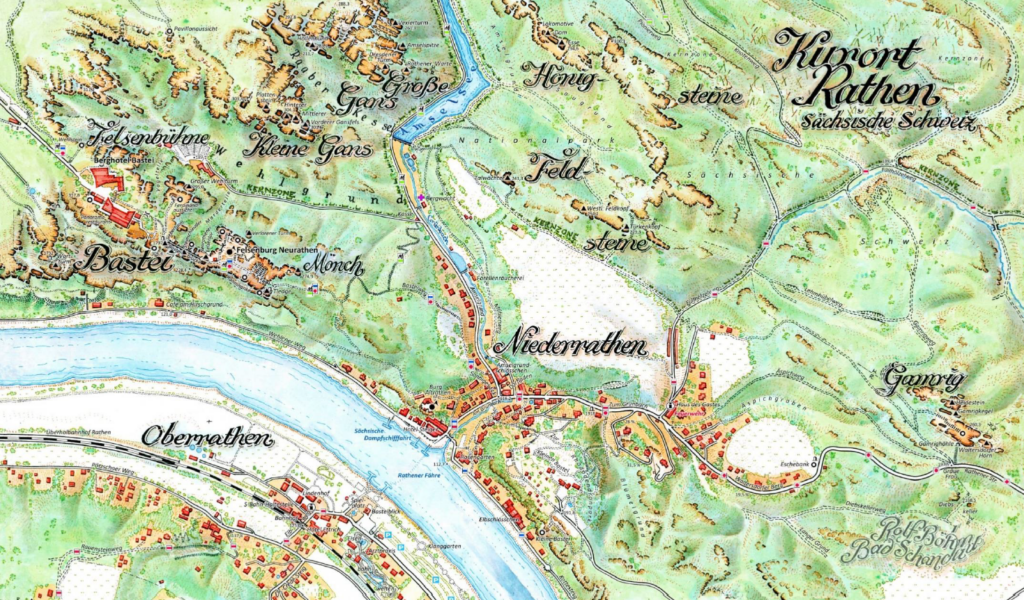 STRECKE: Bahnhof Rathen – Fähre – Neurathen – Füllhölzelweg – (roter Wanderweg) – Polenztal – Schulzengrund – Brand – Brandstufen – Tiefer Grund – Porschdorf – Rathmannsdorf – Bad Schandau